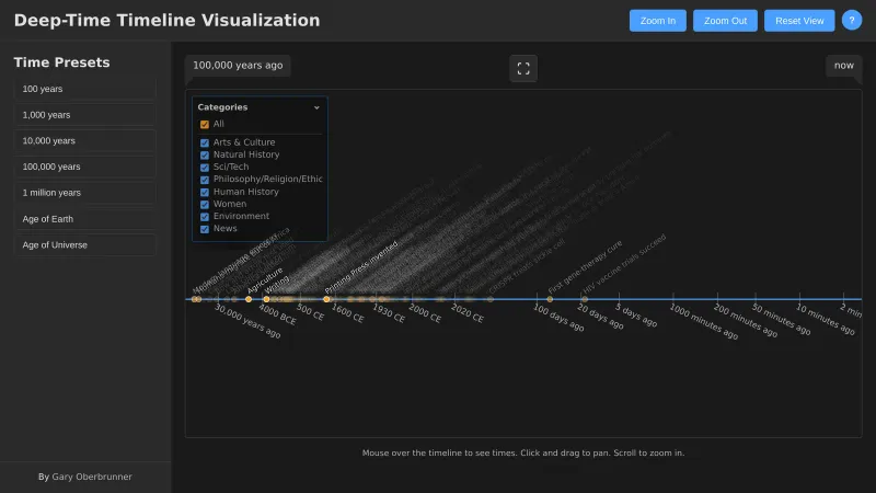 - Deep Time Navigator - Visualize world events through deep time, with log scaling, so you can see how the present (a day, a week, a year) smoothly fades into the very deepest past.